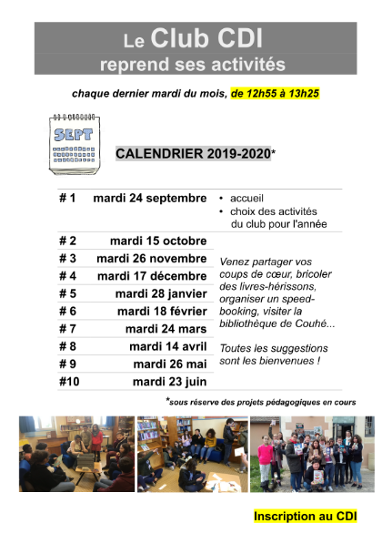 Comme chaque année, le "Club CDI" reprend du service. Cet atelier, proposé mensuellement sur le temps de pause médiane, permet aux élèves inscrits à l'année de partager leurs coups de cœur littéraires, de s'initier à différents ateliers, de visiter la bibliothèque municipale de Couhé... La toute première séance aura lieu mardi 24 septembre. A suivre...