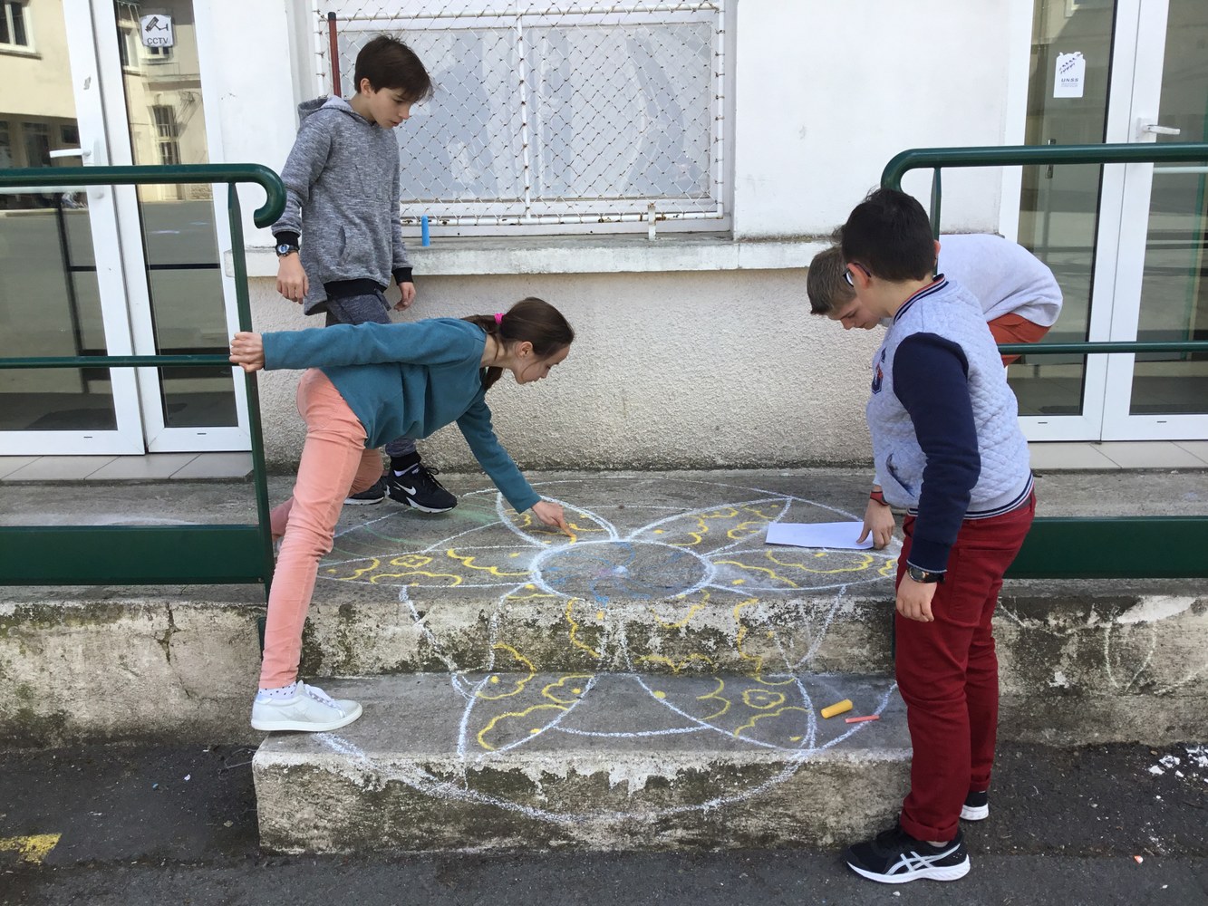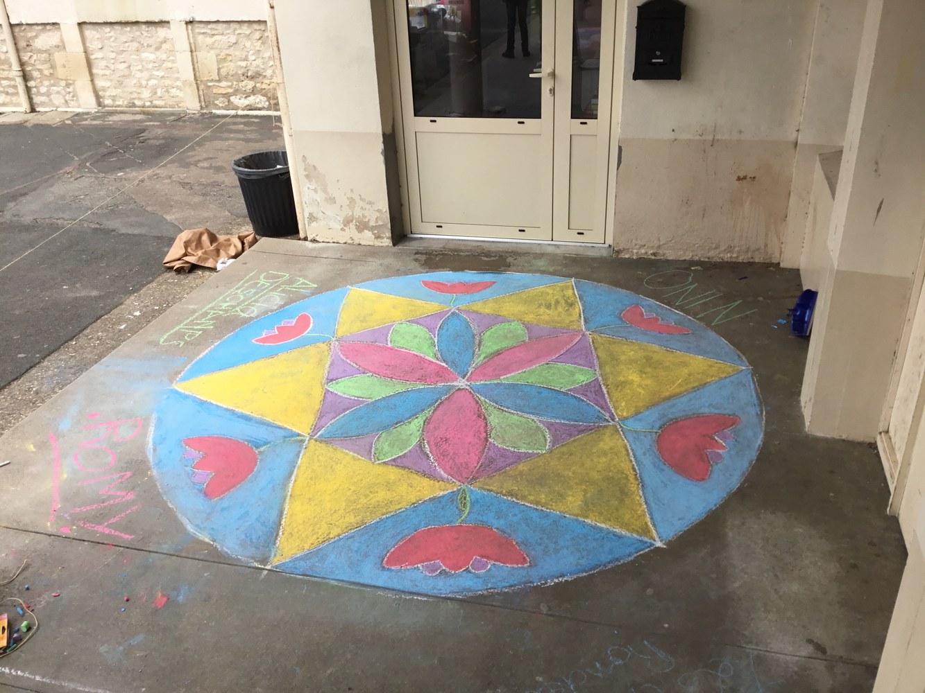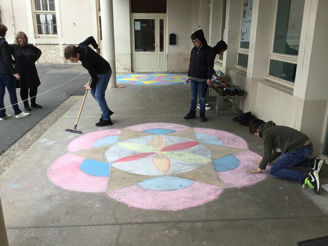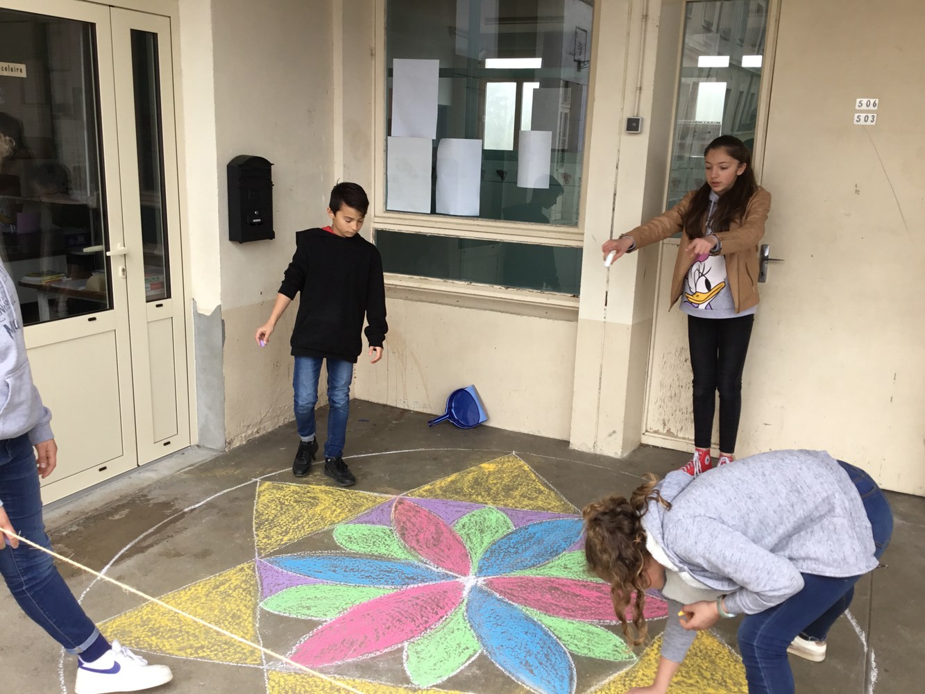 Pendant la semaine de découverte, du 8 au 12 avril, les 2 classes de 6ème ont participé à un atelier "Kolam" (dessin éphémère originaire du sud de l'Inde). Pour continuer l'opération commencée en janvier 2019 « Tamil Nadu et nous » (qui a abouti au parrainage d'une famille du sud de l'Inde pendant un an), les 2 classes de 6ème ont participé le mardi 9 avril à un atelier « Kolam ». Le Kolam est un dessin tracé à même le sol avec de la poudre de riz et des poudres de couleur à l'entrée des maisons en Inde du sud, en guise de bienvenue. Les élèves ont brillamment relevé le défi proposé par leur professeure de mathématiques et réalisé de superbes œuvres éphémères sur l'ensemble de la cour. Ils n'ont pas manqué de faire le lien avec le tricentenaire de la mort de notre créateur, saint Jean-Baptiste de La Salle, et ont également tracé une belle étoile lasallienne. Bravo pour tous ces talents !